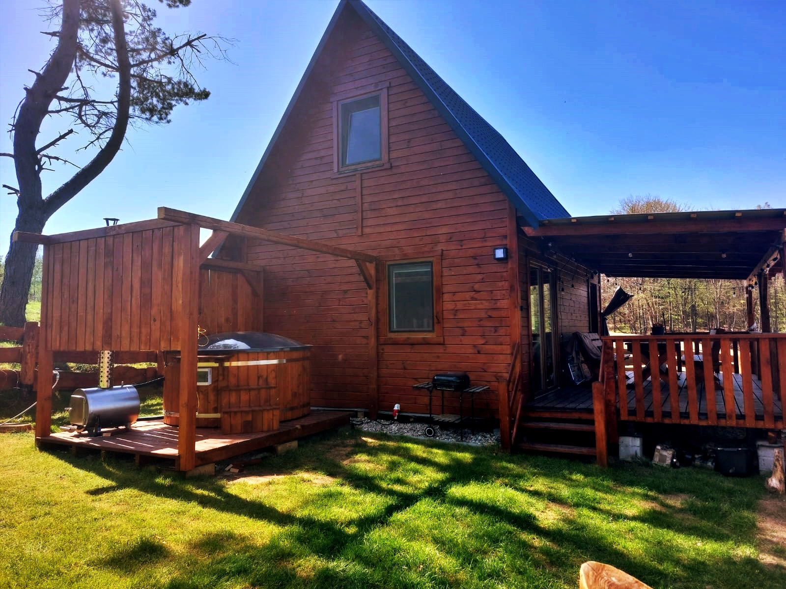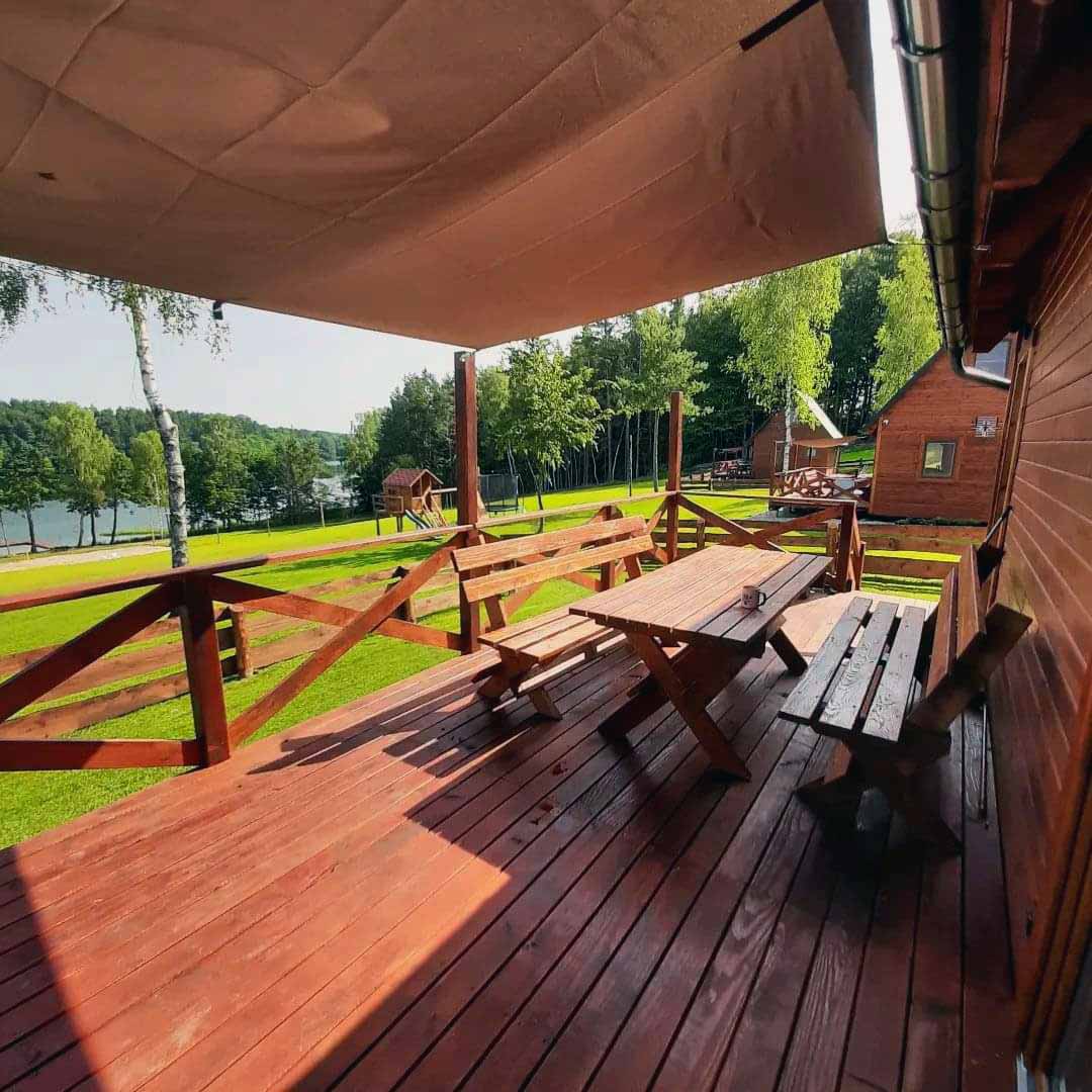 Każdy domek posiada taras z grillem, leżaki oraz pas zieleni, zapewniając komfort i relaks na świeżym powietrzu. W pierwszej linii brzegowej oferujemy także domki z balią, idealne na wieczorny relaks. Na terenie naszego obiektu dostępne jest bezpłatne WiFi (Starlink) oraz parking.